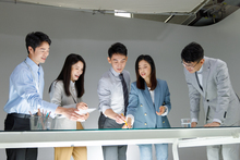 图片标题: 建筑设计师和开发商讨论图纸设计可行性