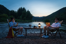 图片标题: 房车旁露营的青年伴侣