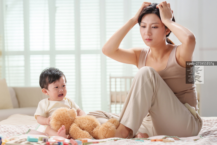 图片标题:     烦躁的年轻妈妈和哭闹的宝宝
