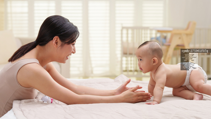 图片标题: 年轻妈妈引导宝宝爬行