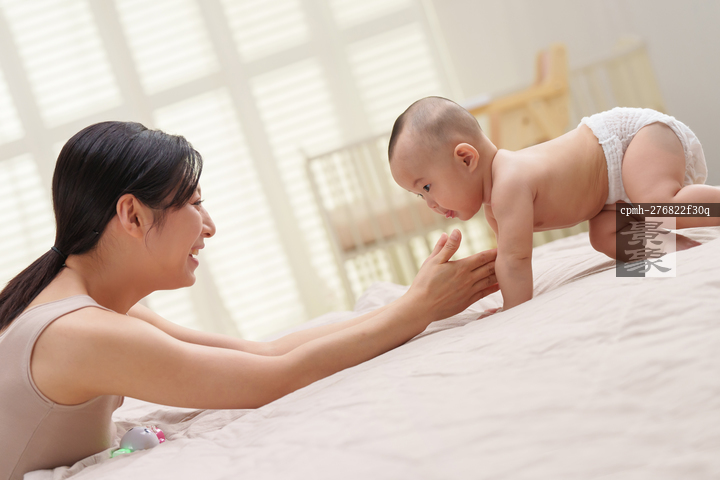图片标题: 年轻妈妈引导宝宝爬行
