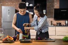 图片标题: 在家做蔬菜沙拉的青年伴侣