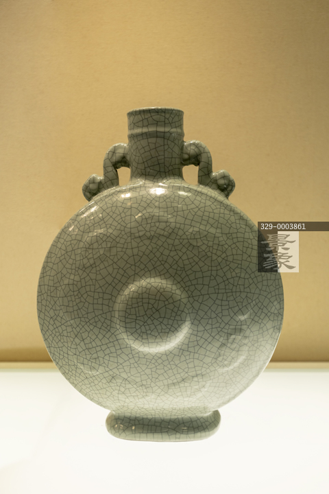 图片标题: 国博中国古代瓷器艺术展-仿哥窑暗花云纹双耳扁壶-清雍正
