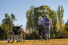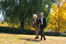 图片标题: 户外观看平板电脑练瑜伽的老年夫妇
