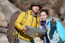 图片标题: 青年登山者伴侣调整登山设备