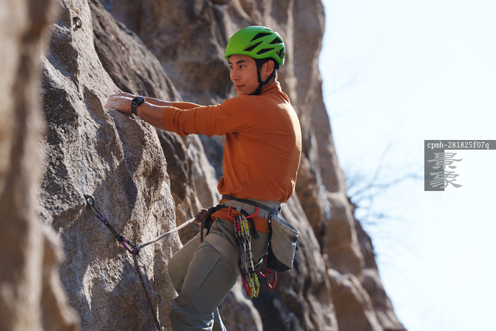 图片标题: 青年男人在悬崖峭壁上攀岩
