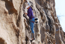 图片标题: 青年女性登山者准备攀岩装备