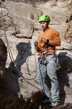 图片标题: 青年女人在悬崖峭壁上攀岩