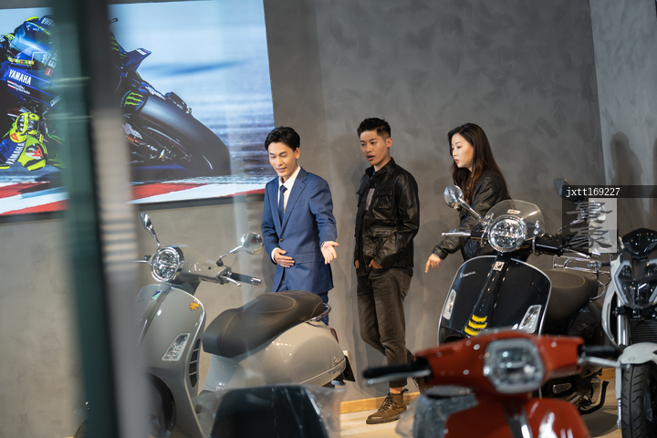 图片标题: 摩托车销售人员为青年伴侣介绍