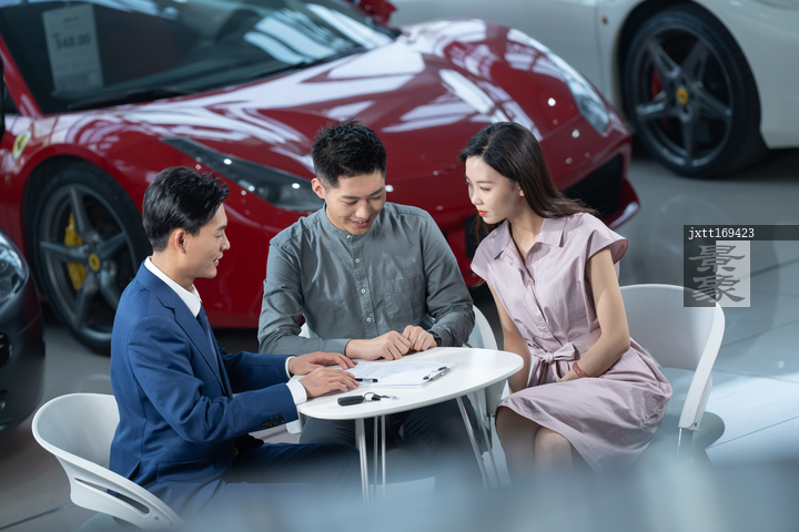 图片标题: 汽车销售人员和青年夫妇签合同