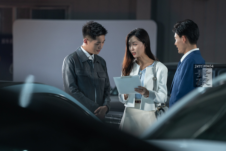 图片标题: 汽车销售人员为青年夫妇介绍