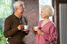 图片标题: 老年夫妇坐在沙发上使用平板电脑