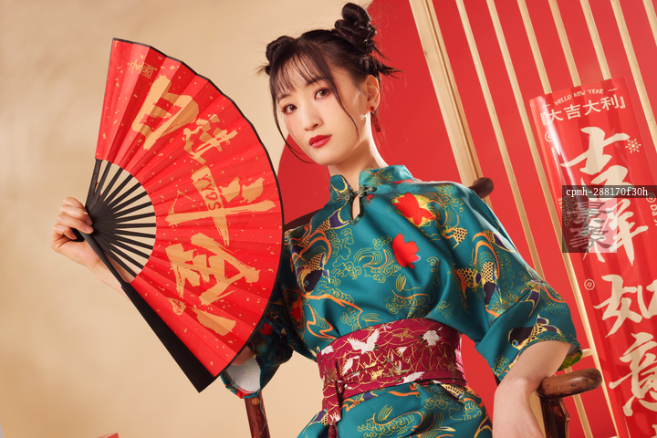 图片标题: 新年拿着扇子的年轻女人