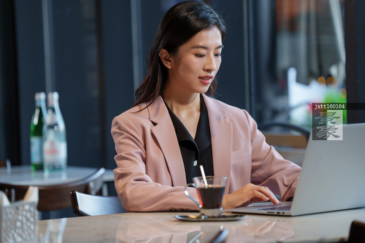 图片标题: 青年女人坐在咖啡厅里使用电脑