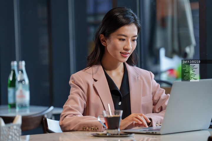 图片标题: 青年女人坐在咖啡厅里使用电脑
