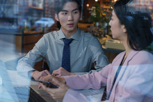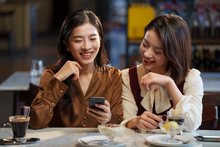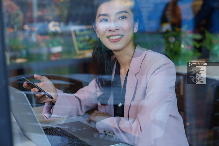 图片标题: 青年女人坐在咖啡厅里使用电脑