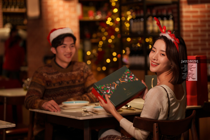 图片标题: 年轻男人给女朋友送圣诞礼物