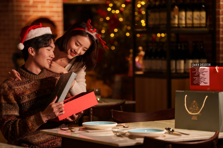 图片标题: 年轻男人给女朋友送圣诞礼物