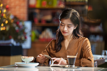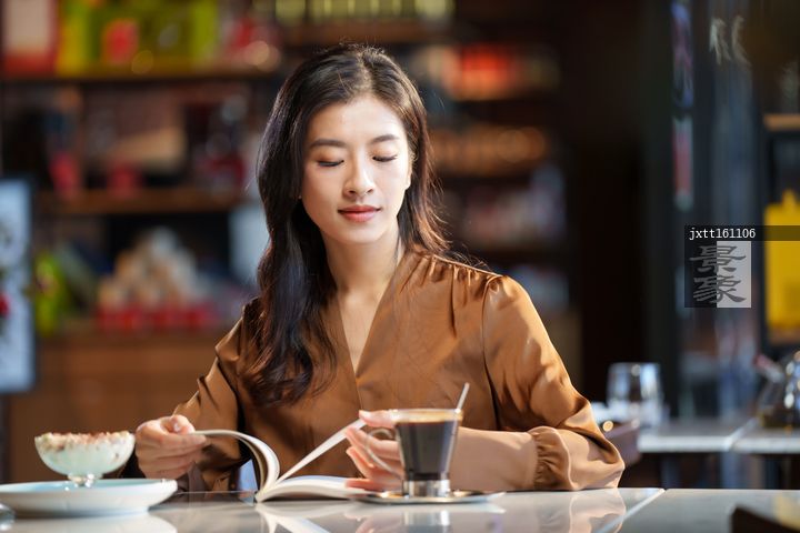 图片标题: 青年女人在咖啡厅里看书