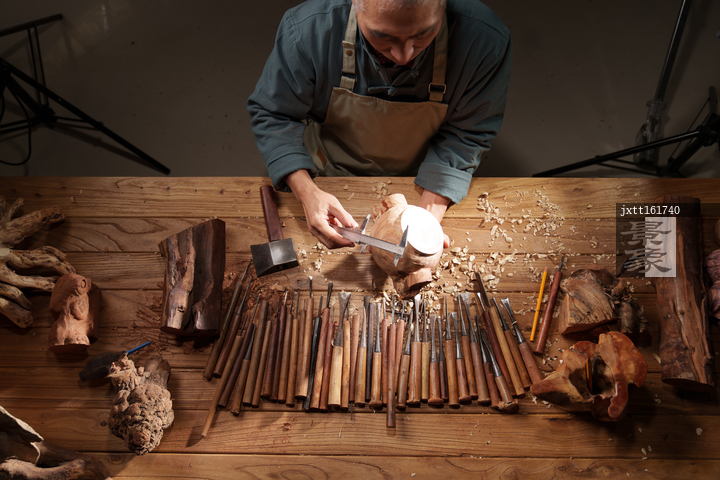 图片标题: 雕刻师和工作台上的大量工具