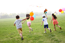 图片标题: 兴奋地小女孩拿着气球玩耍