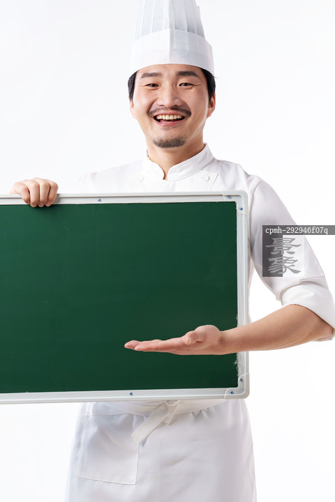 图片标题: 穿着厨师服的中年男人拿着黑板