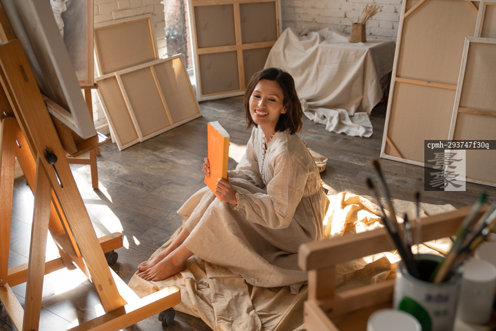 图片标题:     工作室内坐在地上看书的青年画家