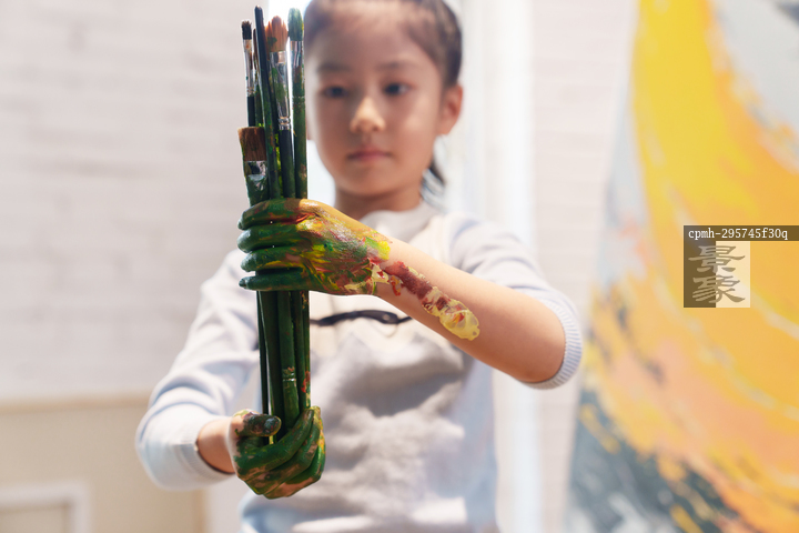 图片标题: 手上涂满颜料的小女孩拿着画笔