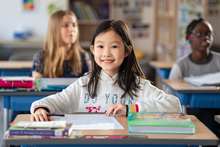 图片标题: 小学生坐在图书室看书