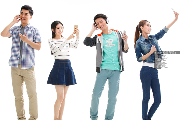图片标题: 四个大学生在使用手机
