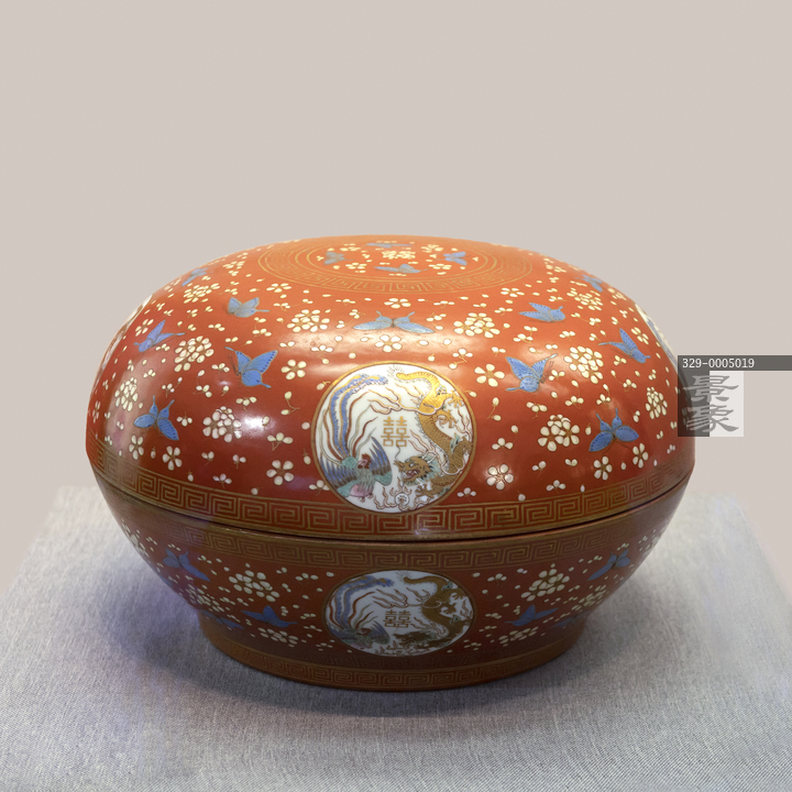 图片标题: 北京颐和园博物馆-红地粉彩花蝶开光龙凤纹圆盘-清同治