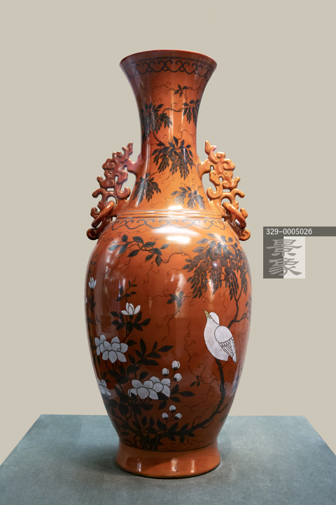 图片标题: 北京颐和园博物馆-珊瑚红地墨彩花鸟纹双耳活环瓶-清光绪