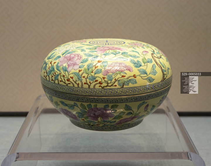图片标题: 北京颐和园博物馆-黄地粉彩花卉团寿纹圆盒-清光绪