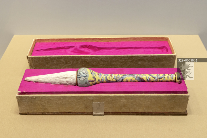 图片标题: 北京颐和园博物馆-黄地粉彩云龙纹瓷管羊毫抓笔-清代-天津博物馆藏