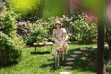 图片标题: 青年美女坐在庭院里看书