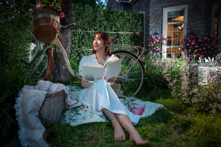 图片标题: 坐在草地上看书的青年美女