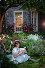 图片标题: 青年美女在开满鲜花的院子里奔跑