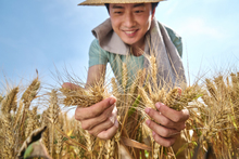 图片标题: 农田里实现机械化收割的农民