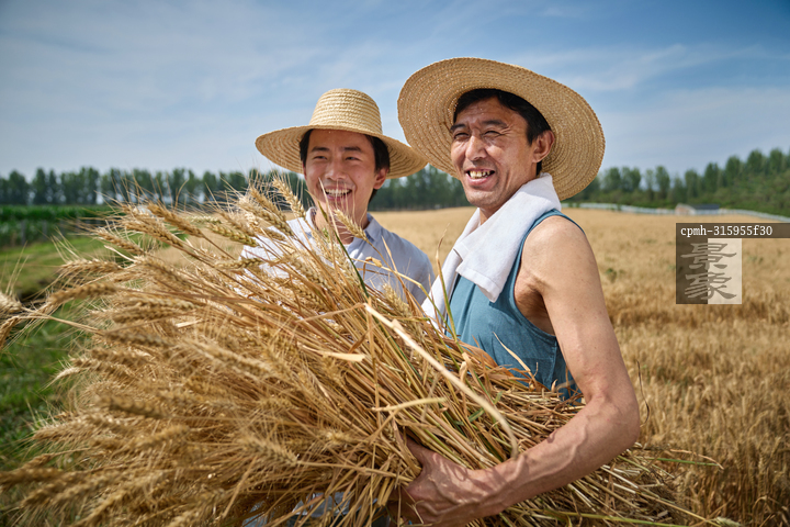 图片标题: 麦田里脸上洋溢着丰收喜悦的农民和科研人员