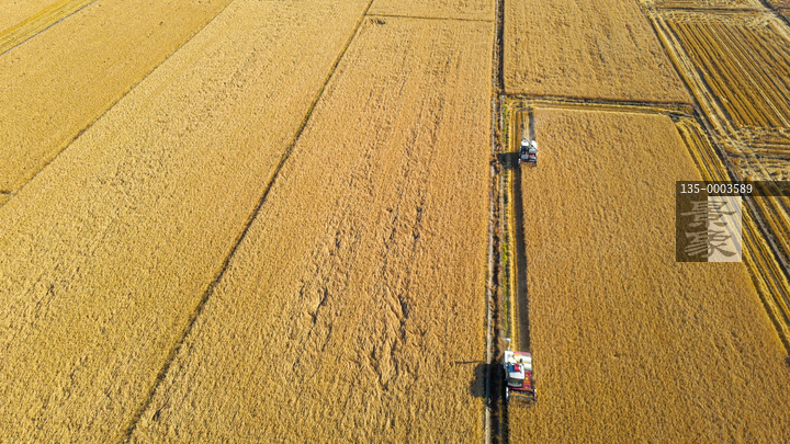 图片标题: 航拍收割机收获的稻田