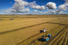 图片标题:     航拍收割机收获的稻田