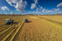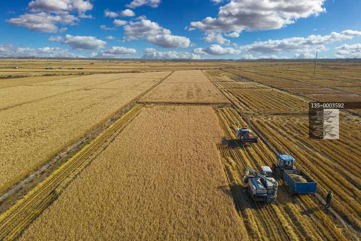 图片标题: 航拍收割机收获的稻田