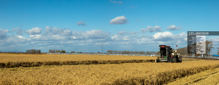 图片标题: 航拍收割机收获的稻田