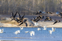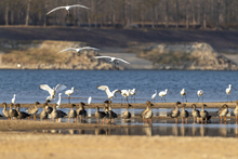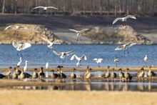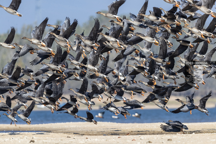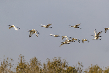 图片标题: 山东郯城:琵鹭竞飞“舞”沂河