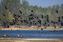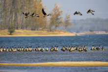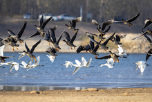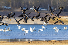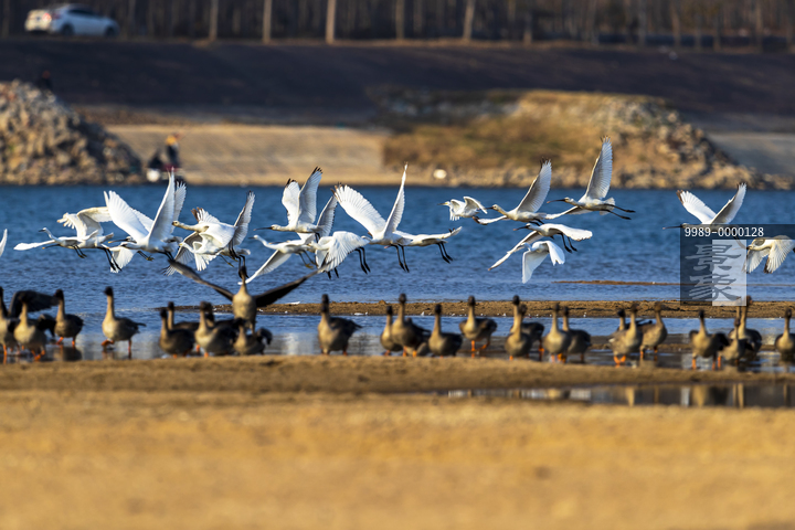 图片标题: 山东郯城:琵鹭竞飞“舞”沂河