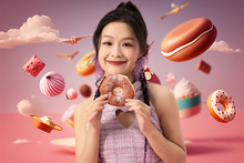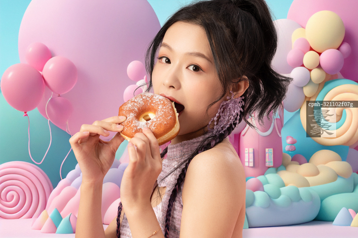图片标题: 吃甜甜圈的快乐女人