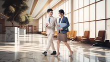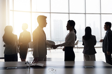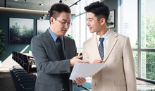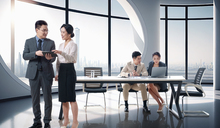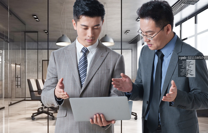 图片标题: 商务人士看着笔记本电脑讨论工作