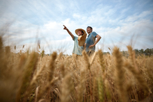 图片标题: 麦田里脸上洋溢着丰收喜悦的农民