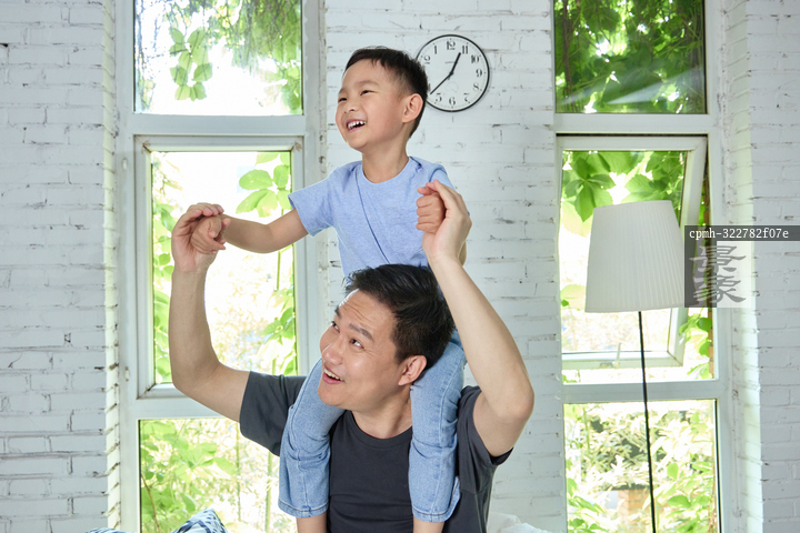 图片标题: 快乐的小男孩坐在父亲肩膀上