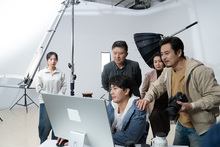 图片标题: 五位亚洲人在摄影棚中,专业摄影师在工作,化妆师和导演在与被采访对象进行沟通。